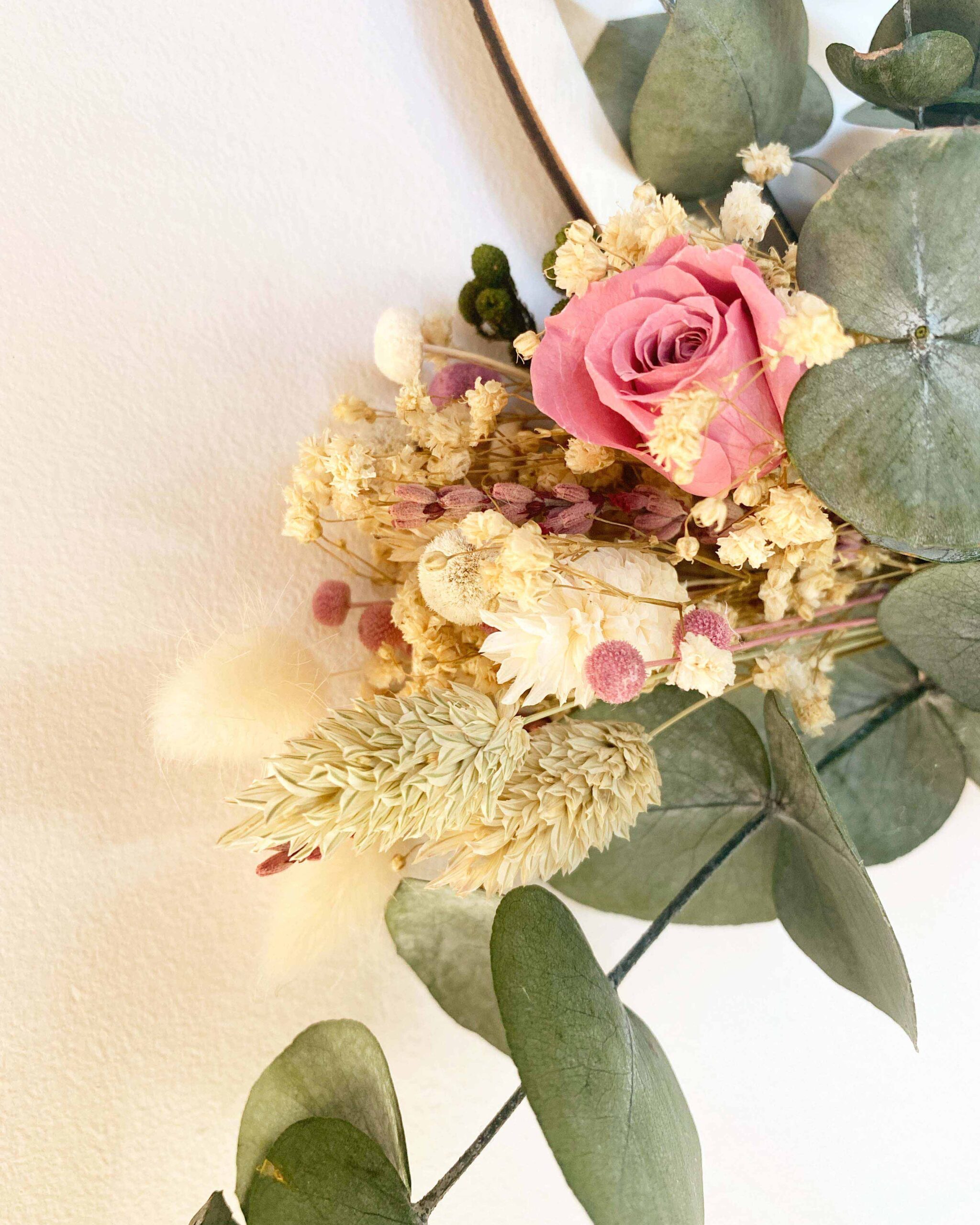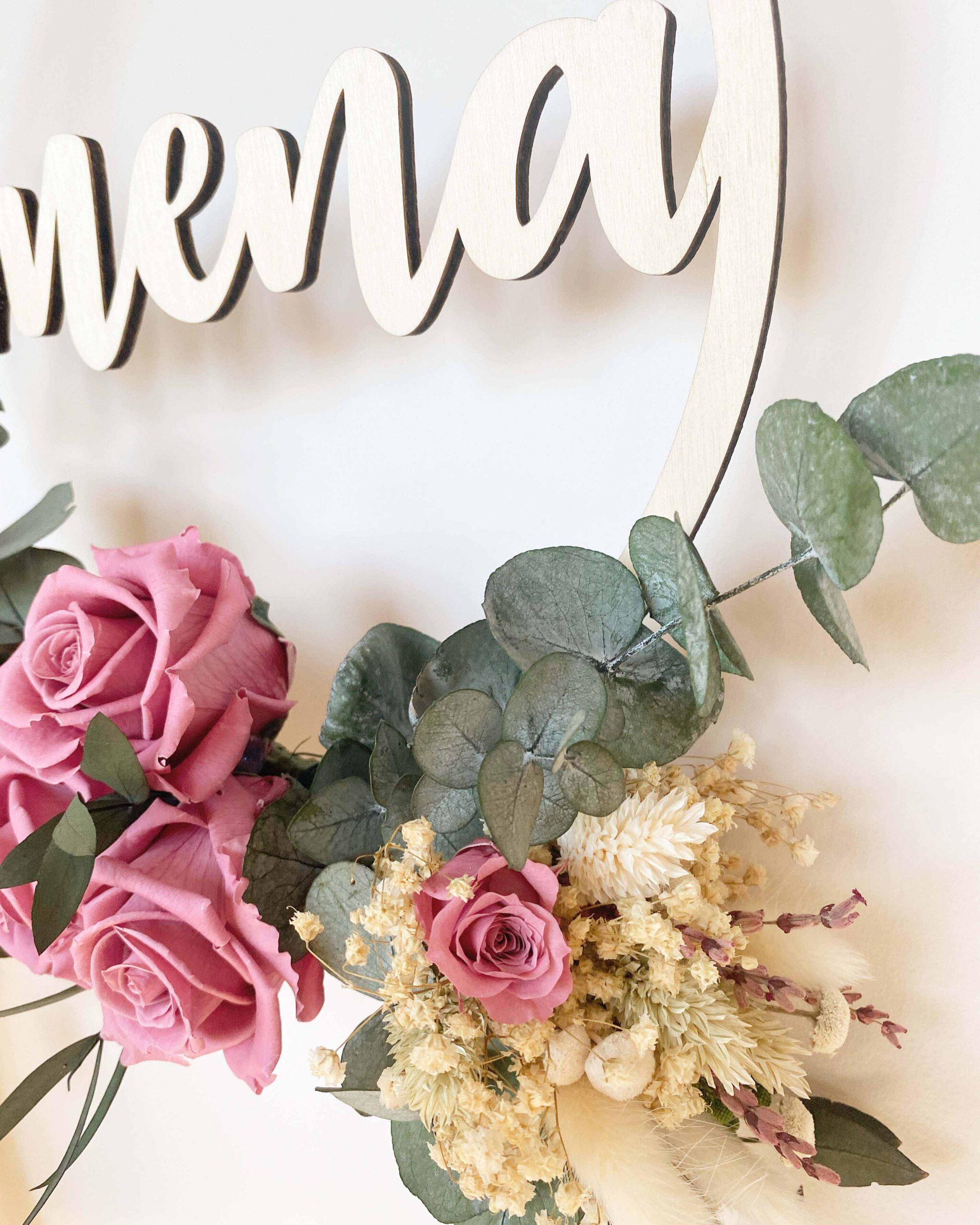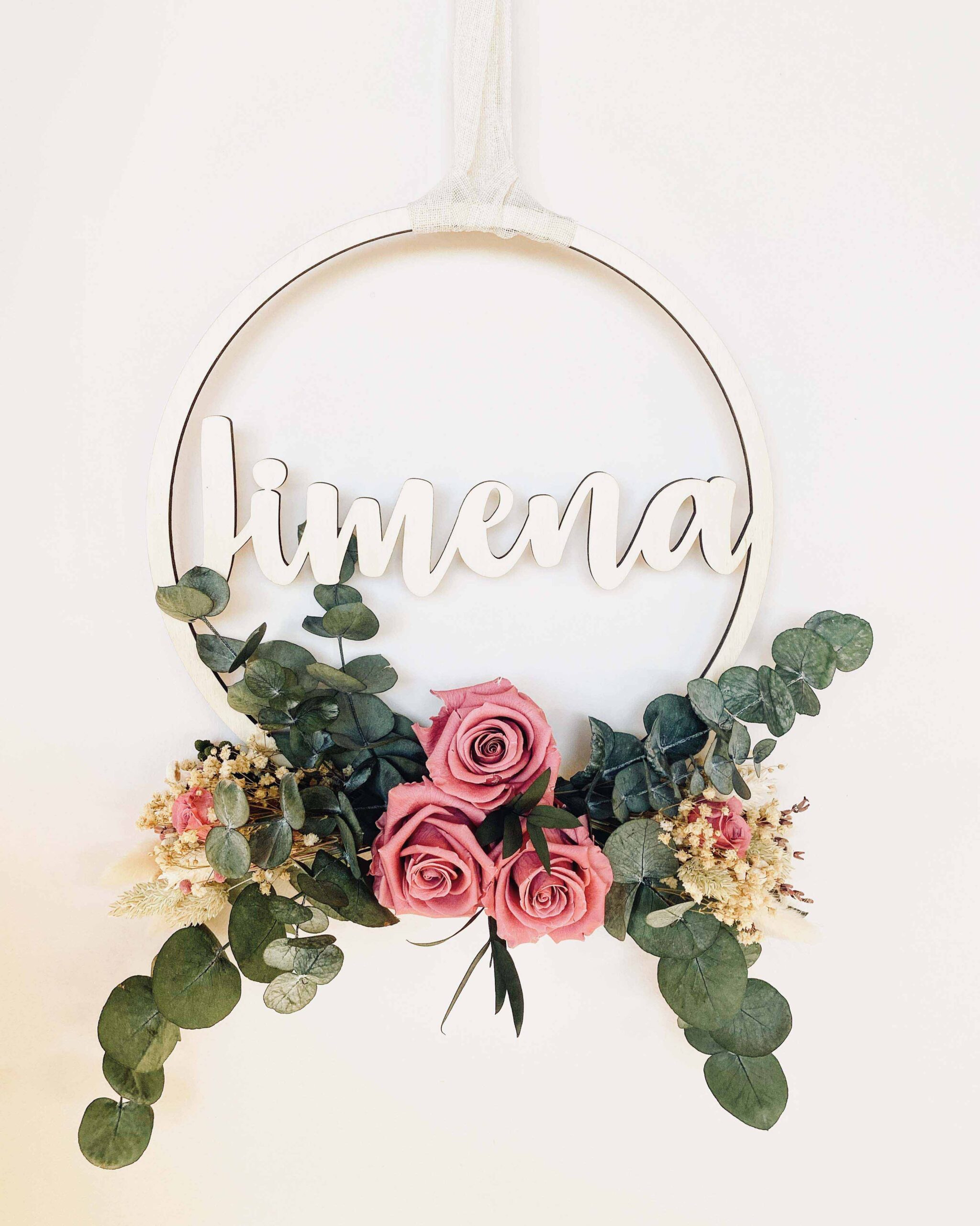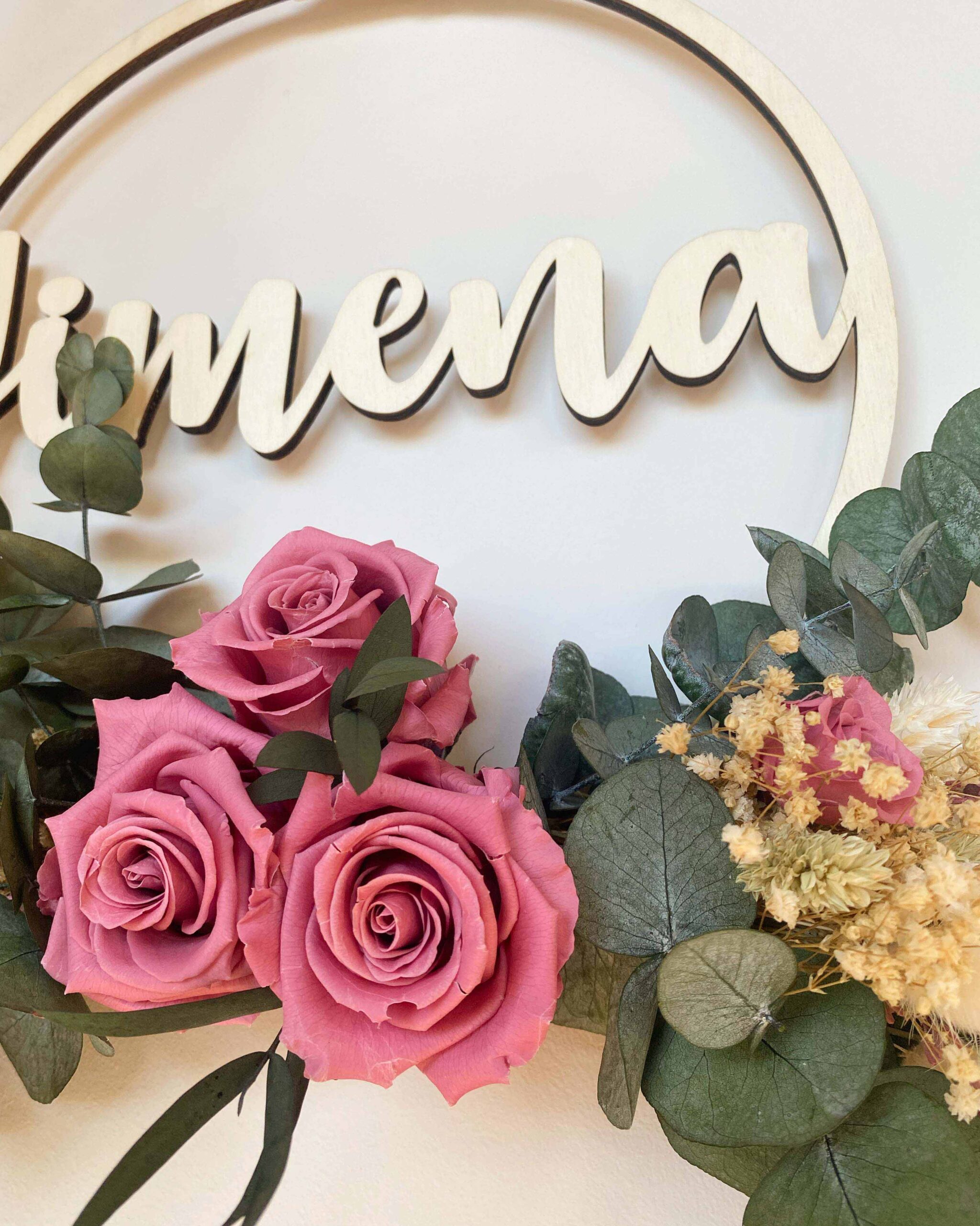 Bastidor de madera con rosas de diferentes tamaños, eucaliptos y flores silvestres y personalizado con el nombre que elijas. Ideal para una boda, un bar de caramelos de cumpleaños o una comunión y que luego tendrás como recuerdo.