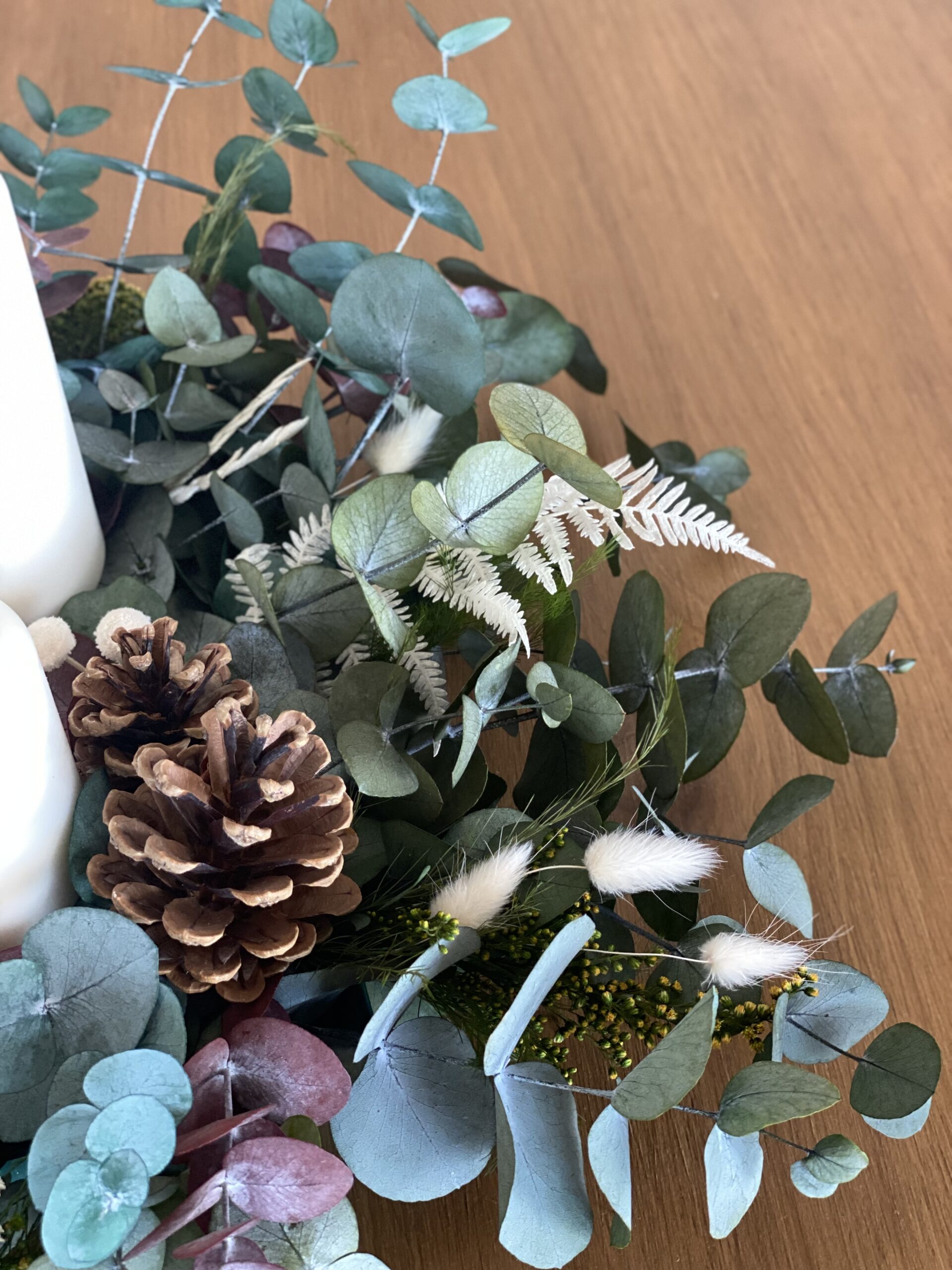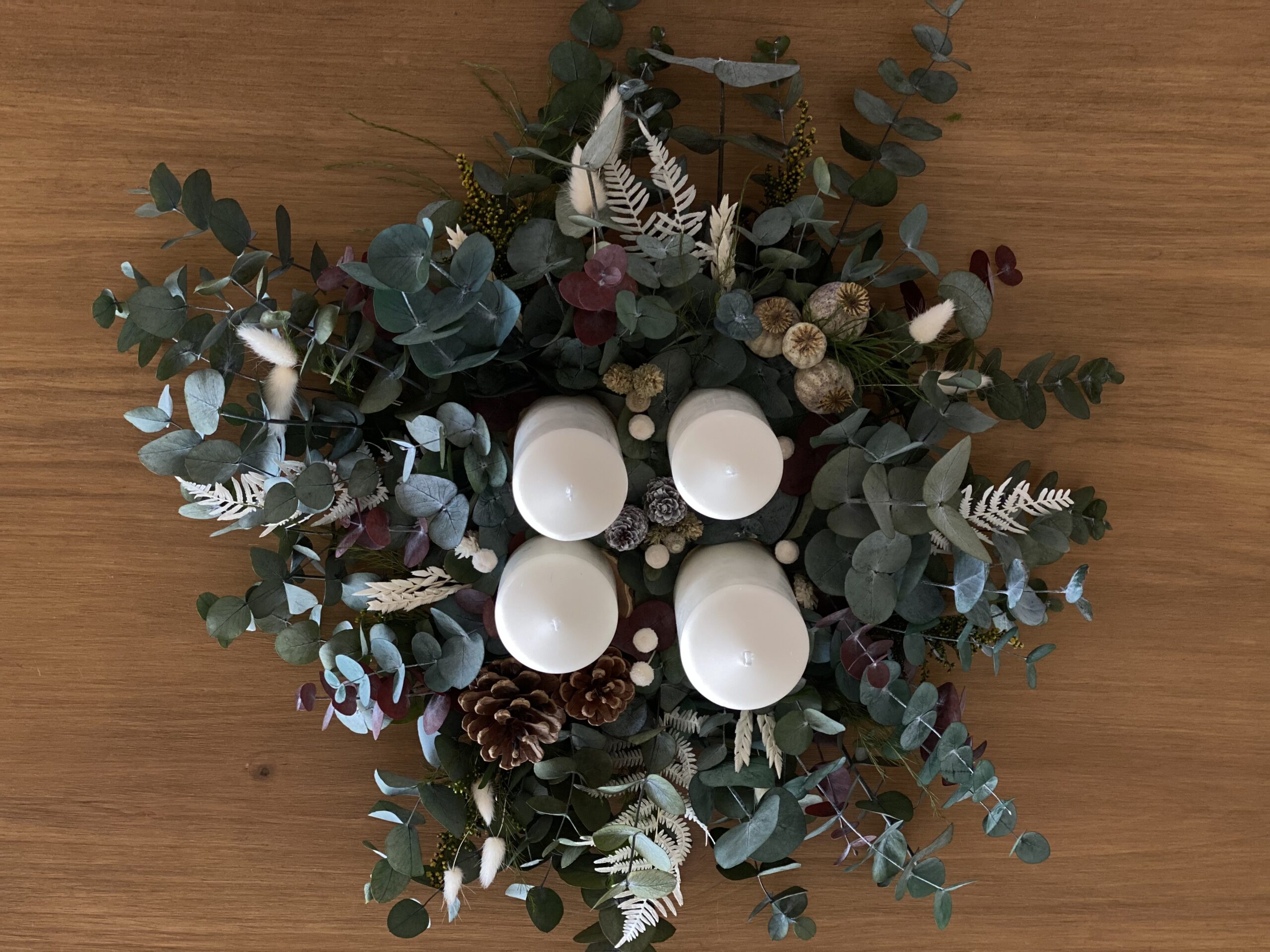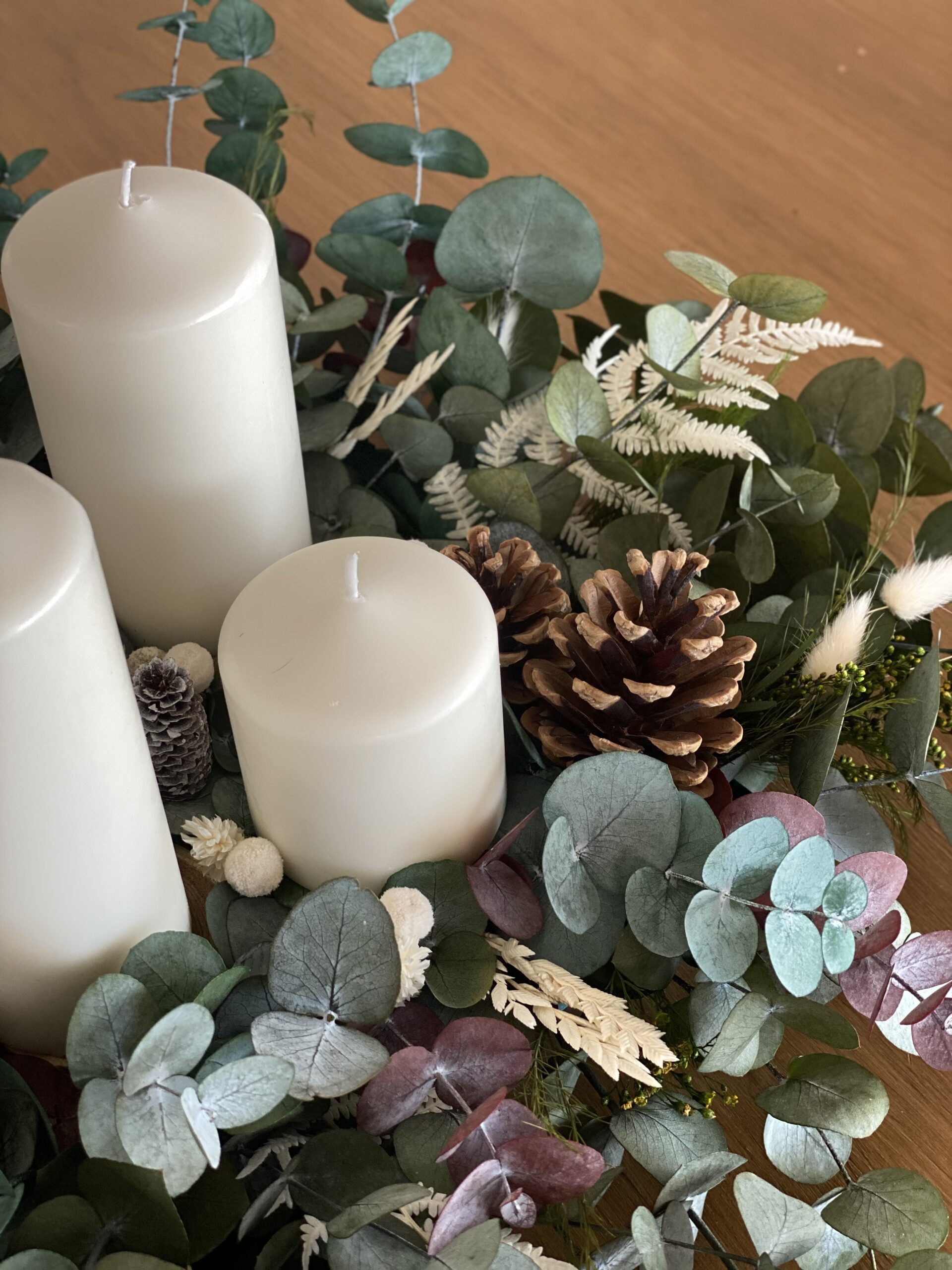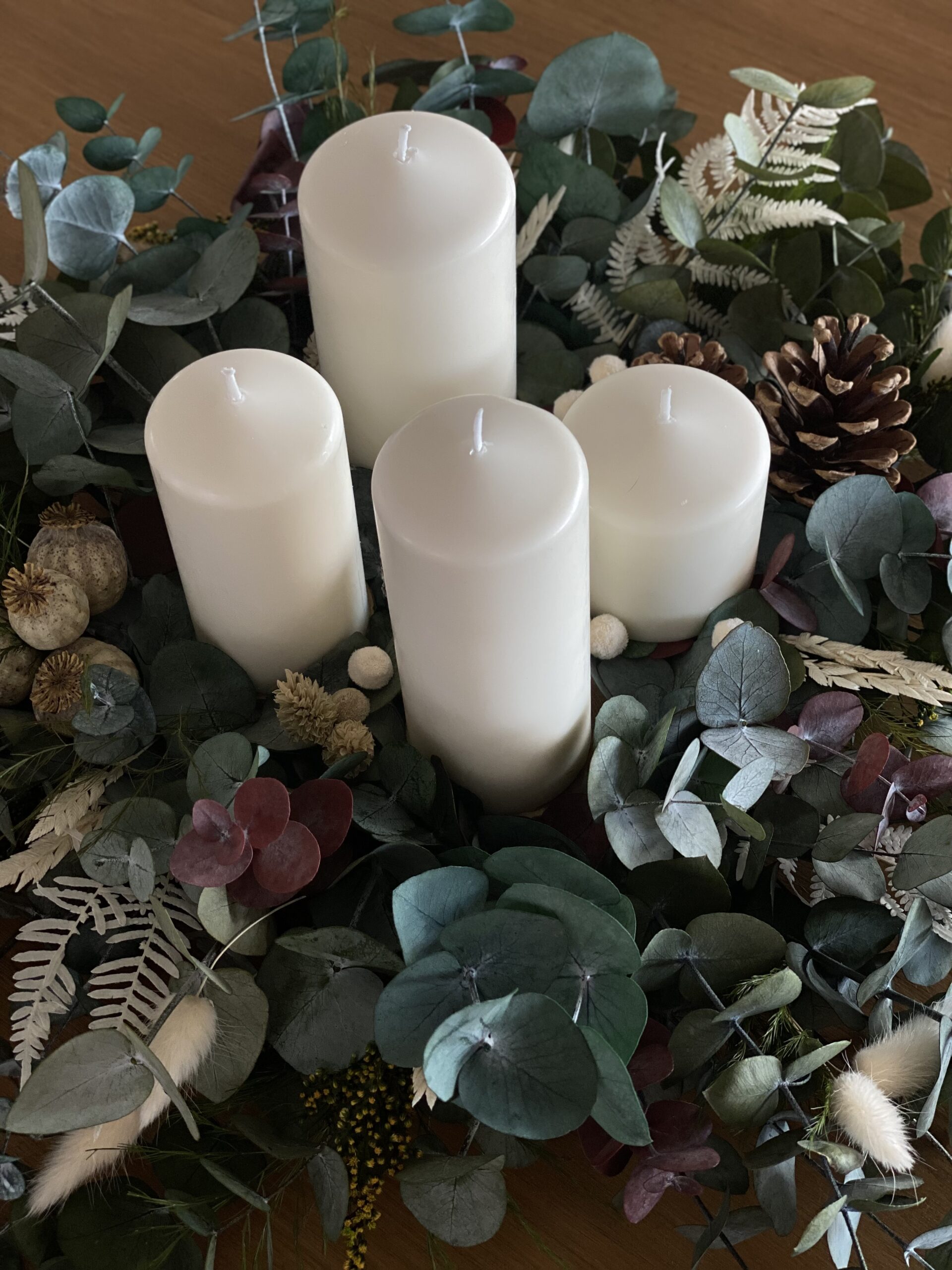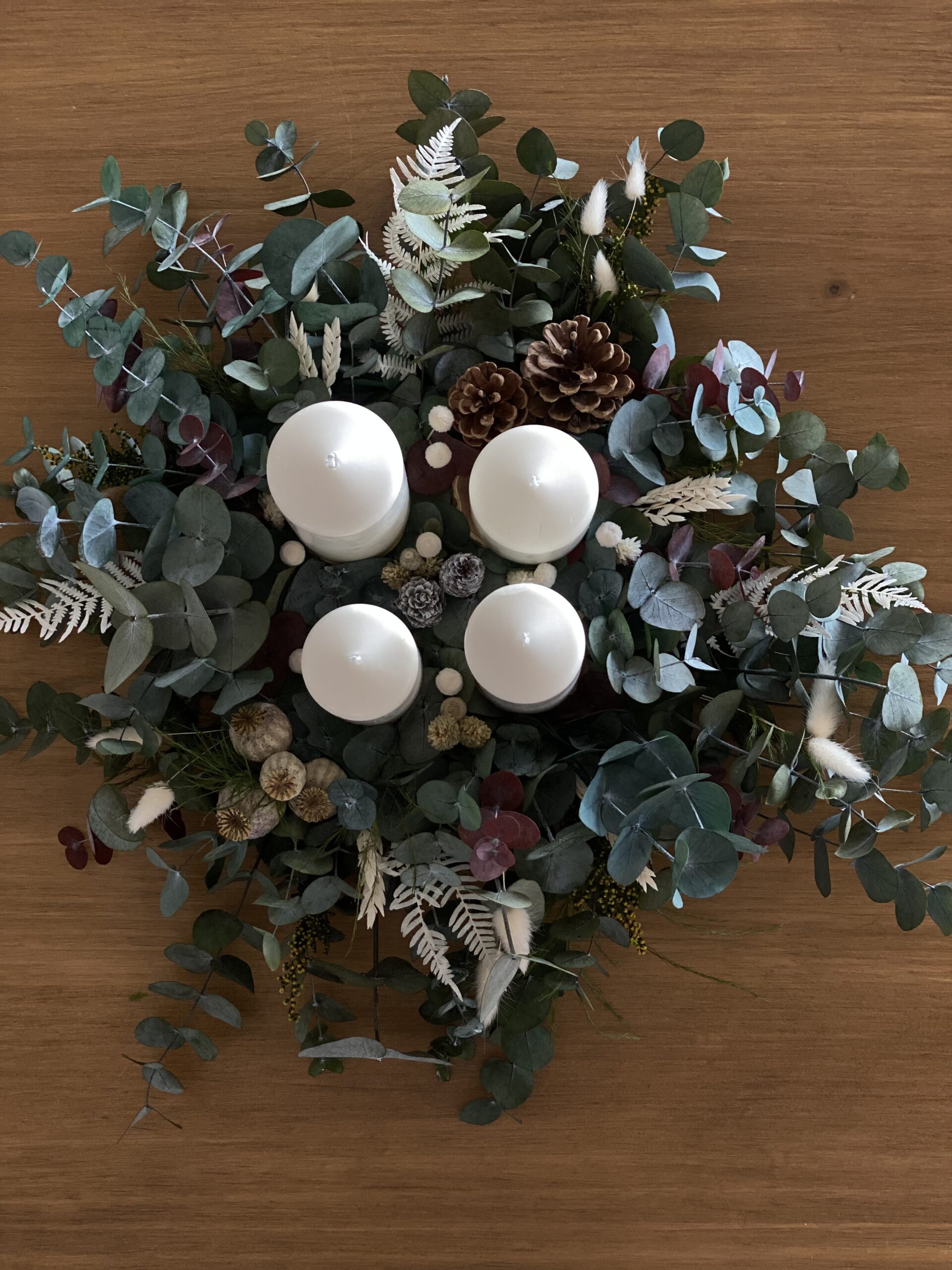 Centro de adviento con selección de eucaliptos, helecho blanco, flores secas y piñas con 4 velas en color blanco natural de diferentes tamaños. Quedará precioso en tu mesa estas navidades. También podrás utilizarlo el año que viene!