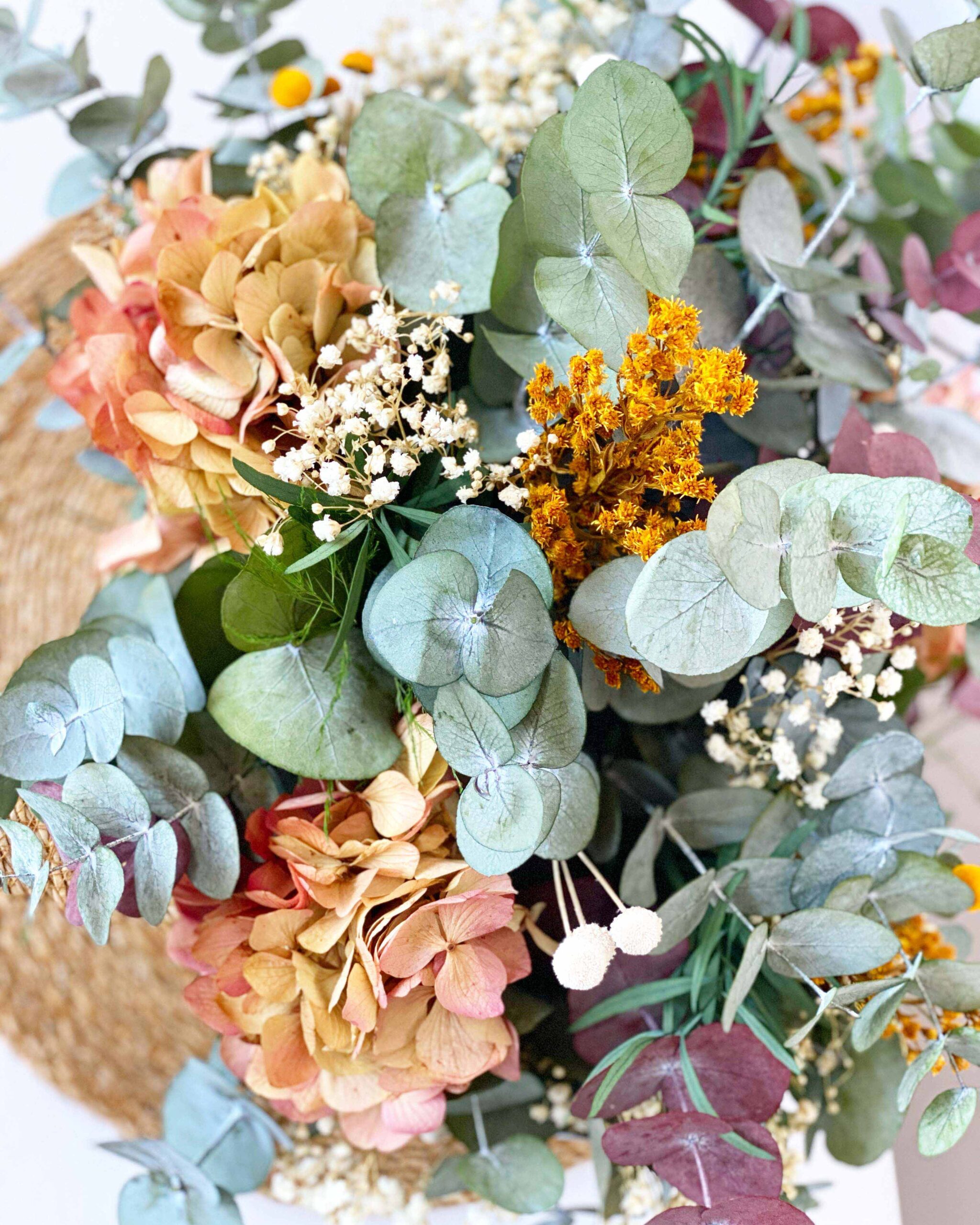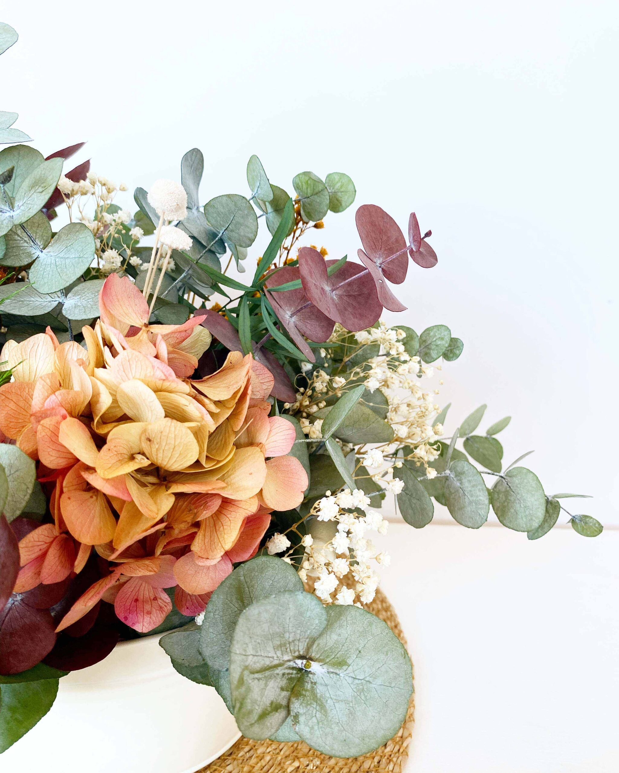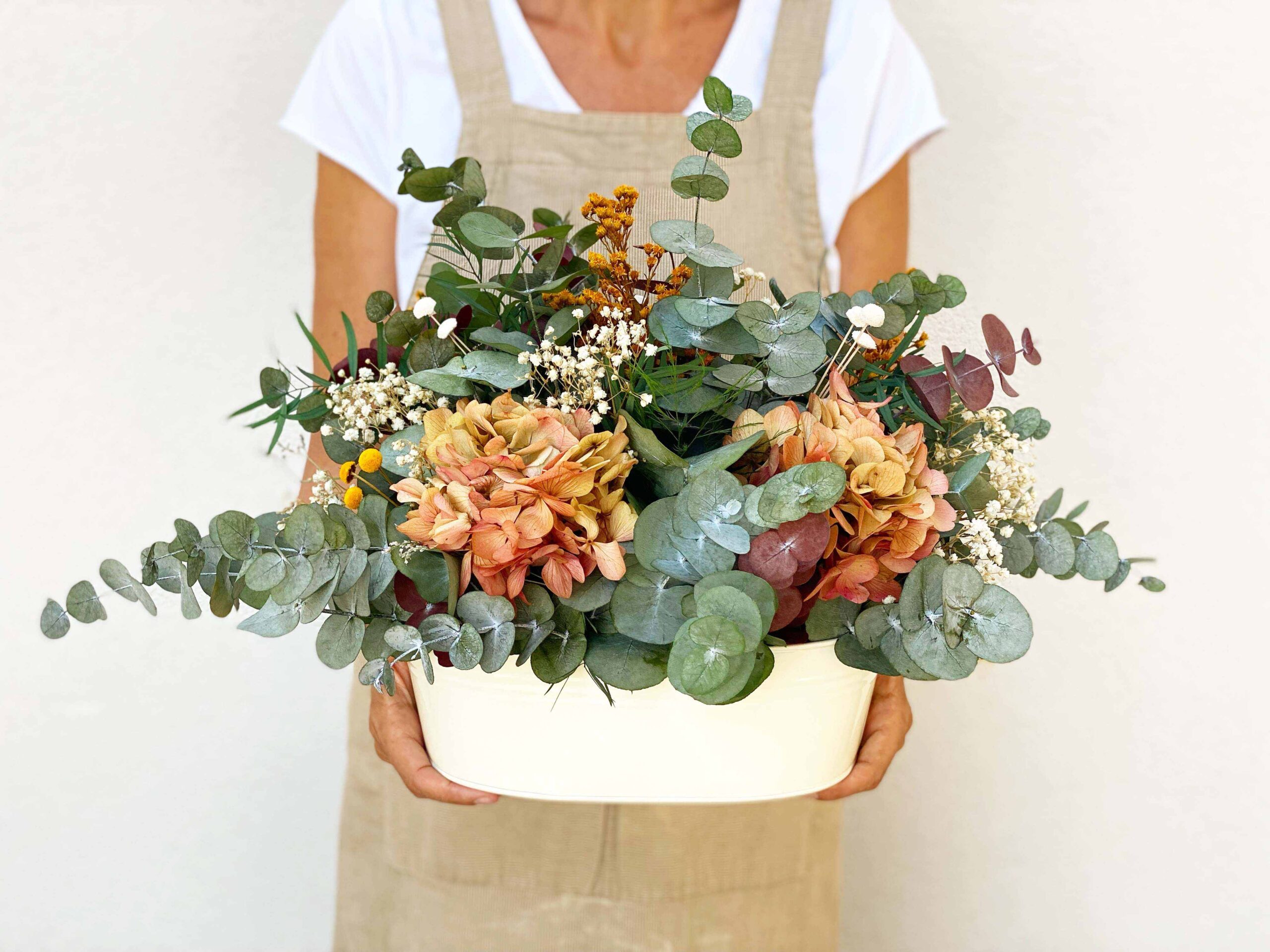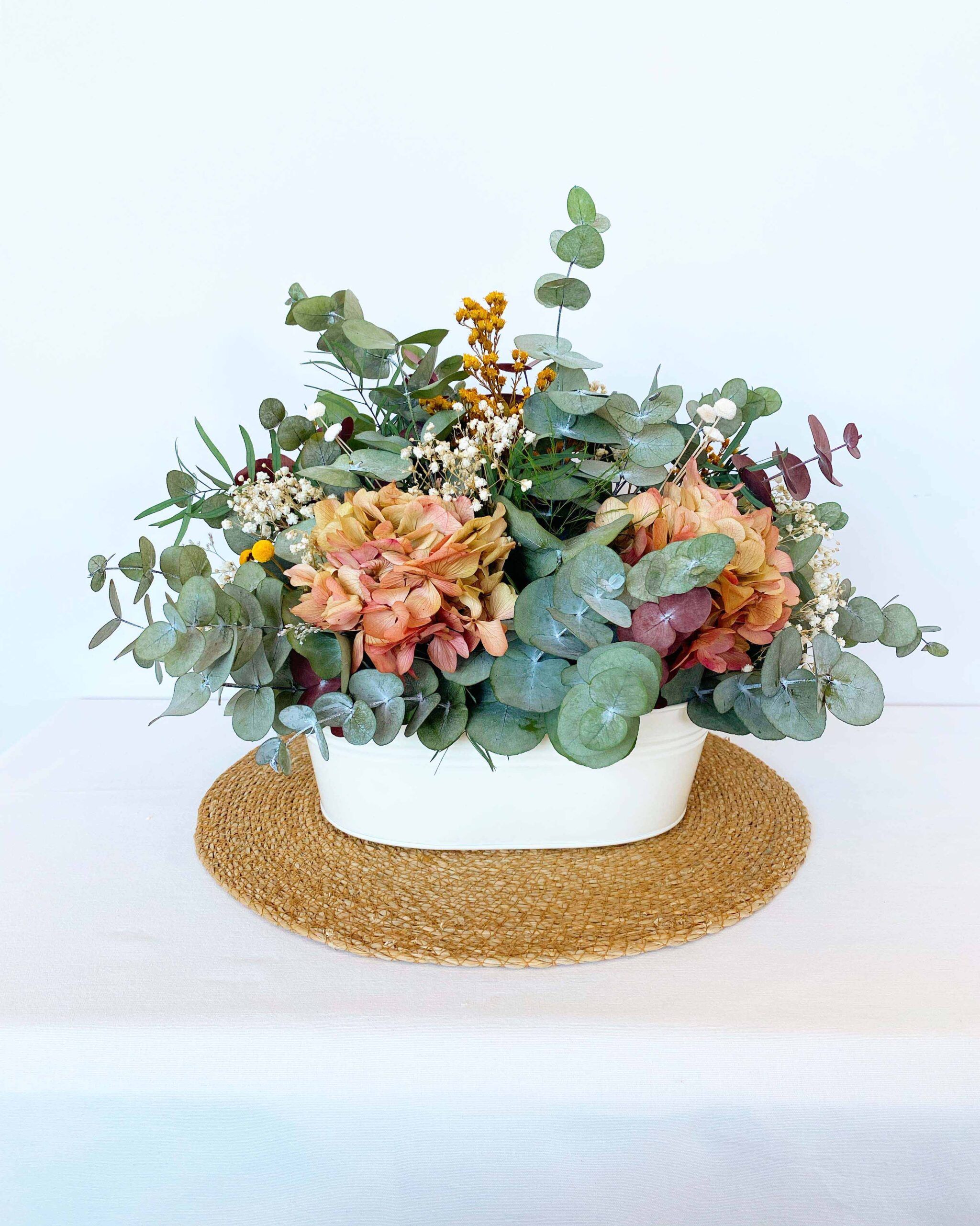 Barreño de zinc con asas en color crema con eucalipto, paniculata, y hortensias bicolor. Ideal para un centro de mesa de comedor o cocina. ¡A nosotros es el centro que más nos gusta!