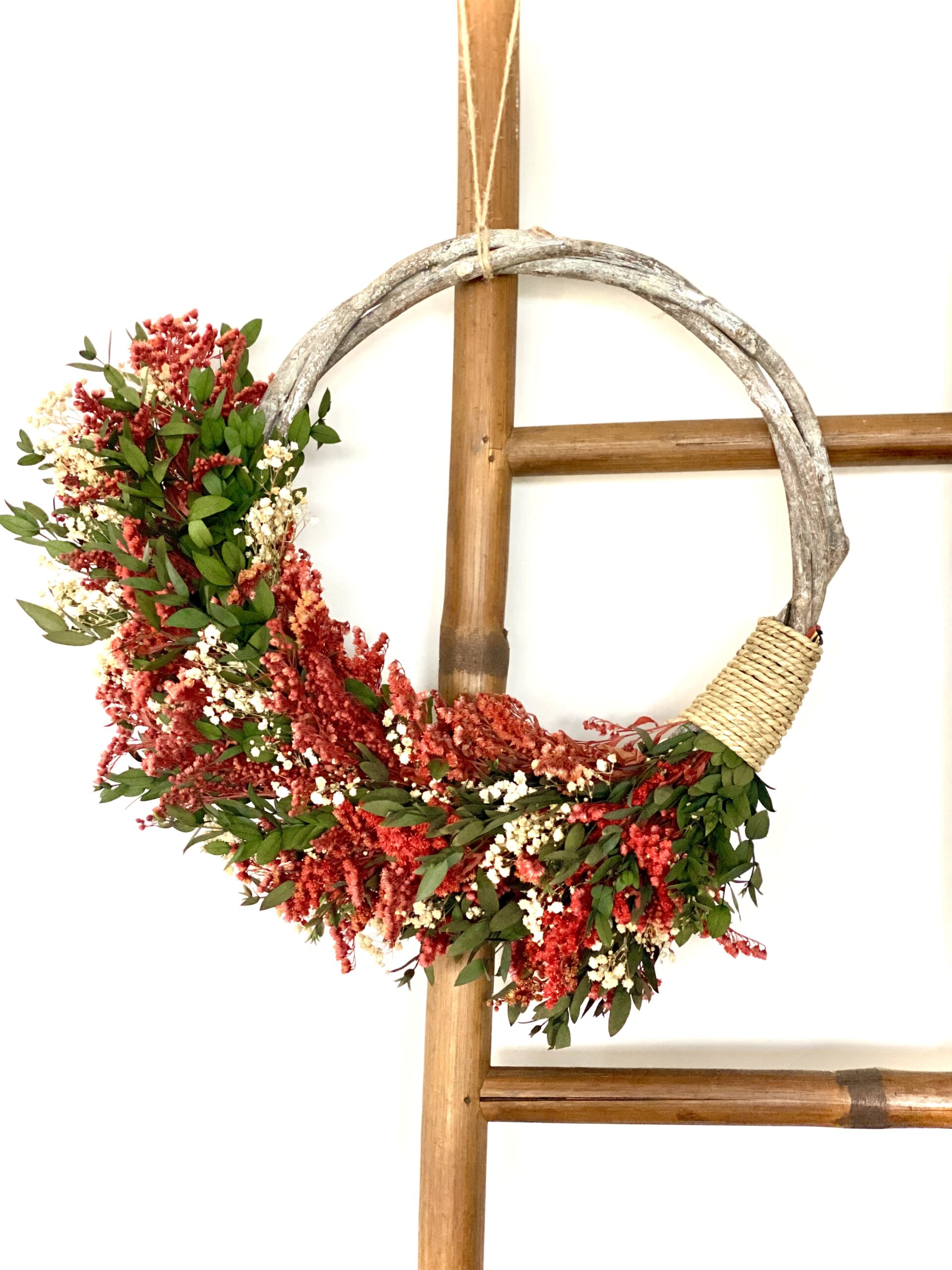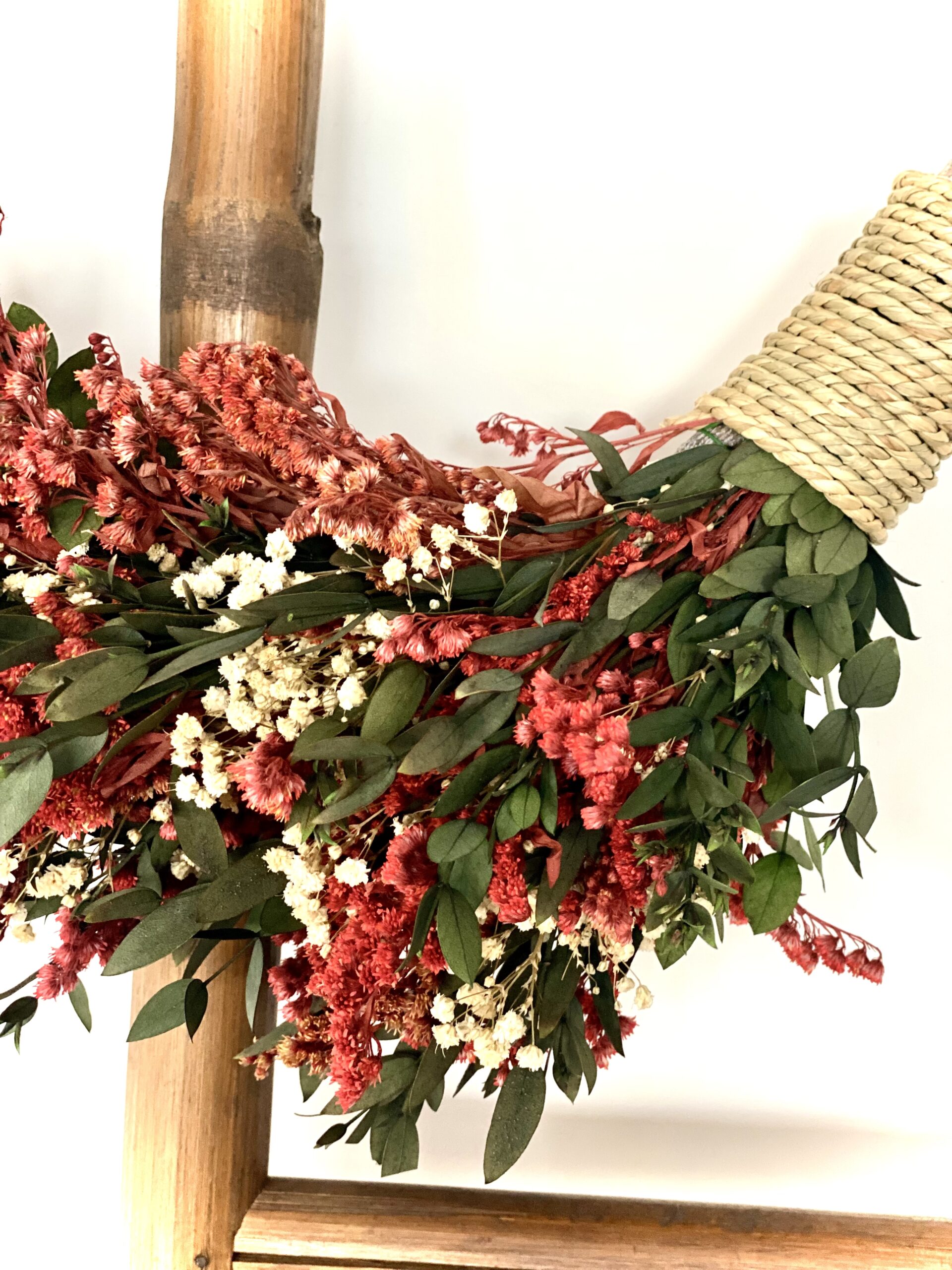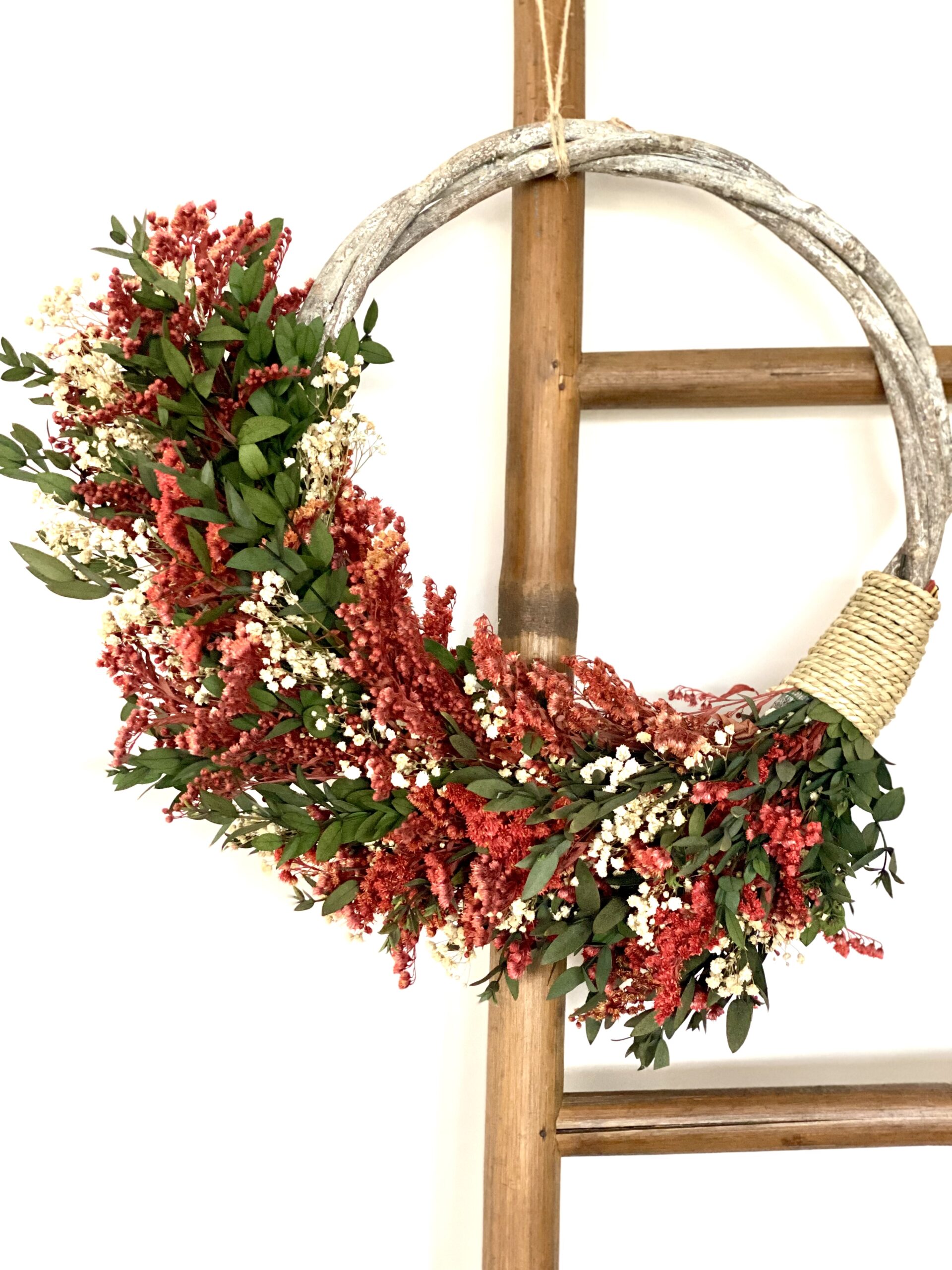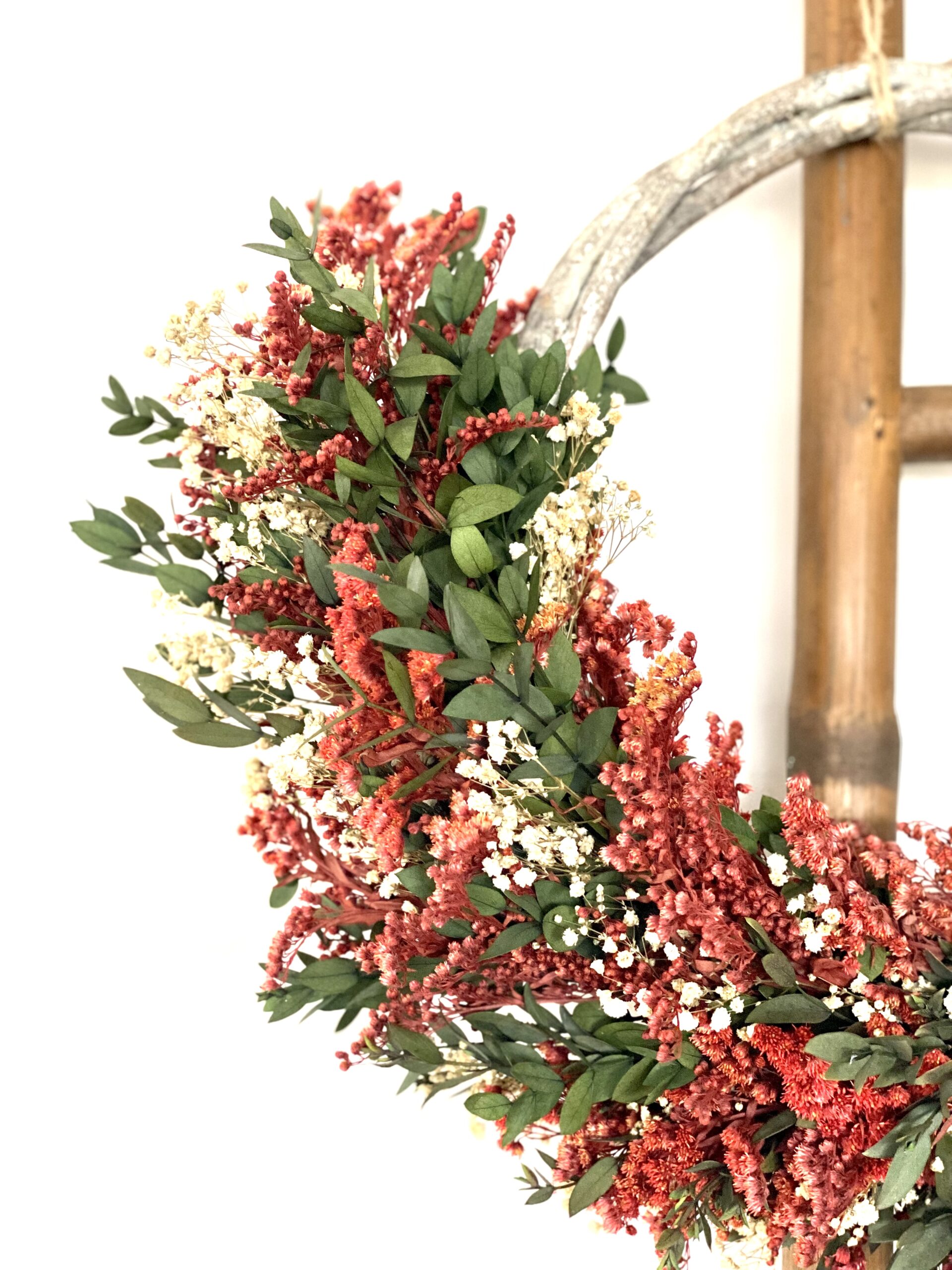 Corona en bastidor de madera trenzada con mucho solidago granate y eucalipto parvifolia para que se vea bien frondosa y pequeños toques de paniculata blanca…te gustará tenerla todo el año!