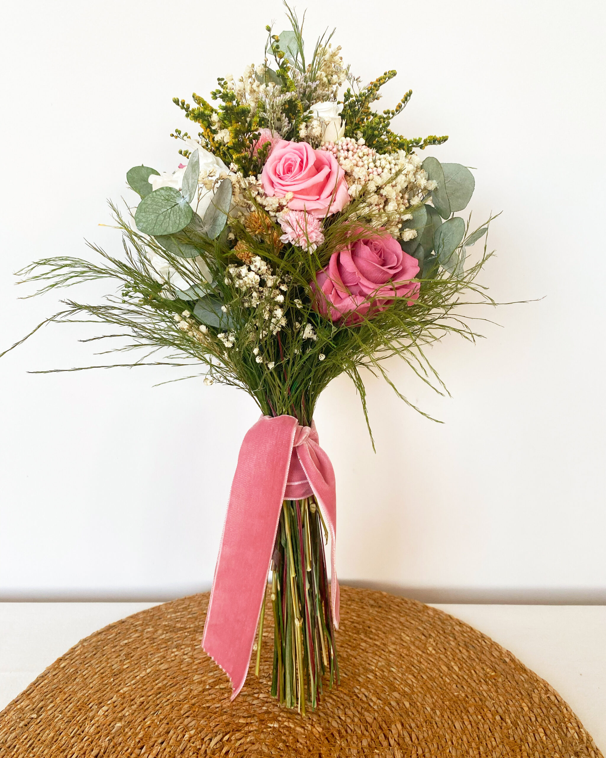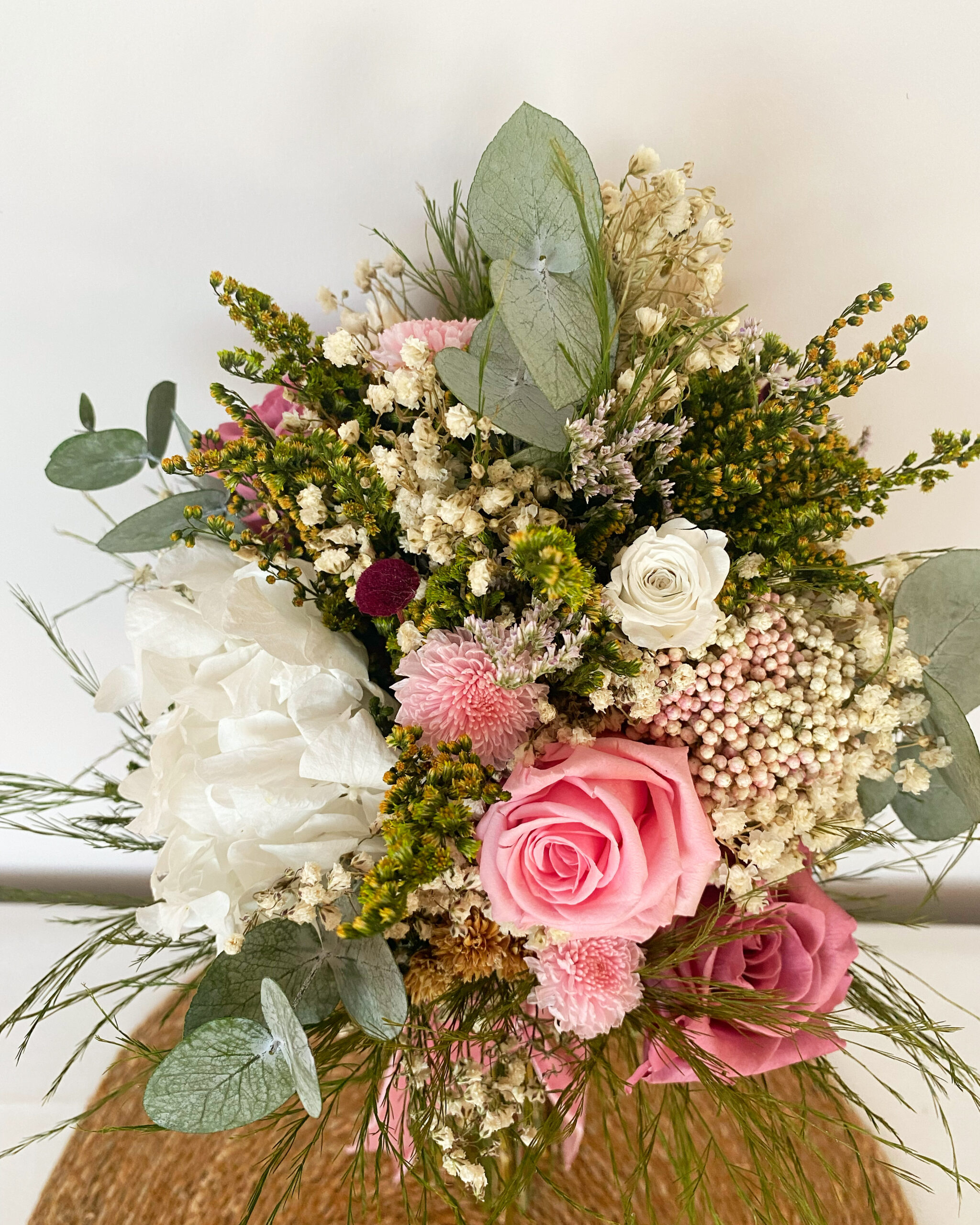 Precioso ramo de novia en tonos rosas y blancos, como en todas nuestras creaciones para novia, rodeando de mucho verde para que resalte con tu vestido.